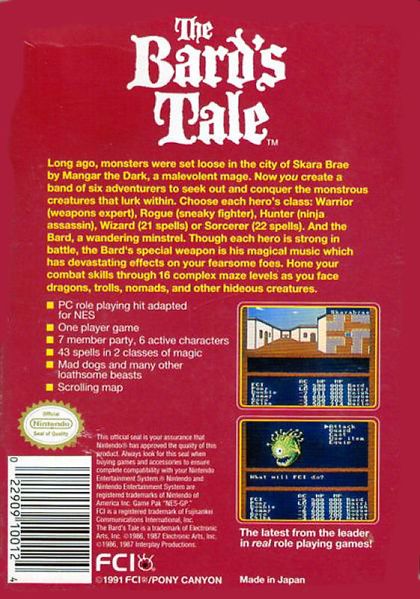 Long ago, monsters were set loose in the city of Skara Brae by Mangar the Dark, a malevolent mage. Now you create a band of six adventurers to seek out and conquer the monstrous creatures that lurk within. Choose each hero's class: Warrior (weapons expert), Rogue (sneaky fighter), Hunter (ninja assassin), Wizard (21 spells), or Sorceror (22 spells). And the Bard, a wandering minstrel. Though each hero is strong in battle, the Bard's special weapon is his magical music which has devastating effects on your fearsome foes. Hone your combat skills through 16 complex maze levels as you face dragons, trolls, nomads, and other hideous creatures.