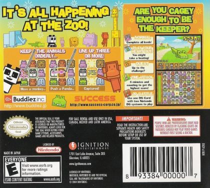 Zoo Keeper includes a variety of play modes to ensure that gamers have depth of gameplay. Players also can take advantage of the DS Wireless Communication to play simultaneous two-player modes that only requires one Nintendo DS Zoo Keeper Game Card.