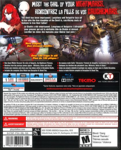The Nightmare Princess follows on the heels of Deception IV: Blood Ties- which revolved around Laegrinna, a deceitful fragment of the Devil's soul who chose between Sadistic Torment, Elaborate Death, or Humiliating Demise, to defeat her foes through trickery. In this new installment players not only relive Laegrinna's entire pursuit to free her father, the Devil, from his eternal prison, they also get introduced to an entirely new, wickedly sadistic, and infernally mischievous character: Velguirie. Velguirie's story is covered with a shroud of mystery and the player will have to solve the one hundred quests in the brand new Quest Mode to find out who she really is. The only certainty is that Velguirie is an incredibly dangerous creature that takes extreme pleasure in setting up intricately complex combinations of traps to lure her victims to their untimely- yet in her eyes wildly entertaining- death.