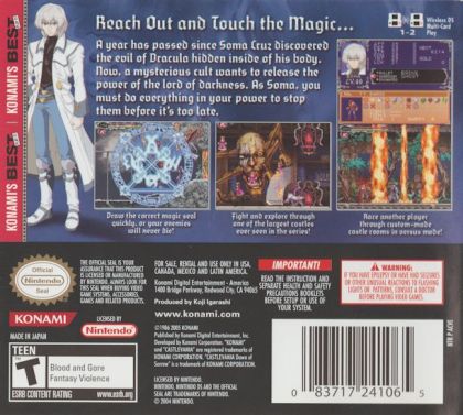 The year is 2036, one year after the events of Castlevania®: Aria of Sorrow™. Soma Cruz finds himself at the center of a mysterious cult's plan to resurrect their evil lord and master Dracula. In order to save himself and protect the lives of those he loves, Soma must infiltrate the enemy's home base, a towering replica of Dracula's castle that is teaming with monstrous creatures.