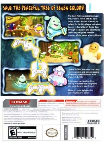 An original Wii title, Dewy's Adventure uses the Wii-Remote to control the elements and tilt the ground of the game world as players help a small droplet of water save its home from a mysterious dark force. The game is set on a world where pure water and green forests have flourished, and which once enjoyed centuries of peace and prosperity under the careful watch of the Elder Tree.