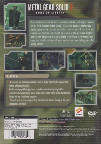Snake returns in the highly anticipated action title, Metal Gear Solid 2: Sons of Liberty for the Sony PlayStation 2 computer entertainment system. Players take on the role of a one-man army determined to stop a deadly high-tech weapon from falling into the hands of a highly elite resistance group called Dead Cell. Players must utilize their skills in stealth, weaponry and counter-terrorism to fight off the competing powers and destroy the gigantic war machine, Metal Gear Ray.