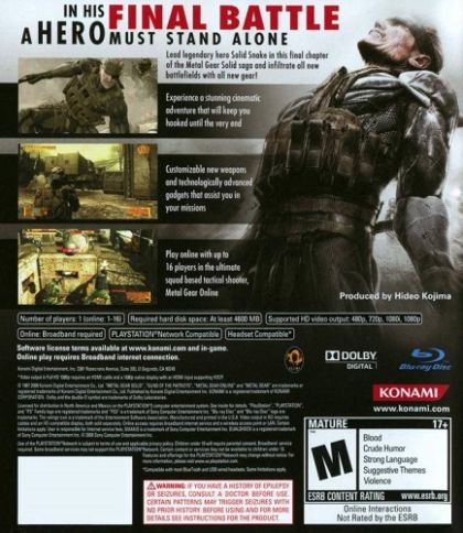 Metal Gear Solid 4: Guns of the Patriots is the final chapter in the saga of Solid Snake which sends him around the world in pursuit of his arch nemesis, Liquid Ocelot. Armed with new gadgets and abilities, Solid Snake must shift the tides of war into his favor, using the chaos of the battlefield to infiltrate deep into enemy territory. In his globetrotting final mission, Snake must sneak deep into enemy locations in the Middle East, South America, and other corners of the earth to foil Liquid Ocelot's plans for total world domination.