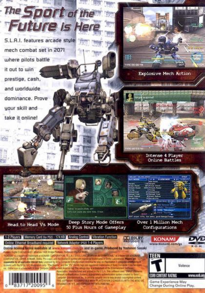 Konami brings the first online mech combat game to the Sony PlayStation 2 entertainment system with SLAI Steel Lancer Arena International. This fast paced mech action is the sport of the future, where players pilot their customized mechs to win cash and worldwide dominance. Over 1 million possible mech configurations and phantom stealth abilities make this one mech party you'll have to crash.