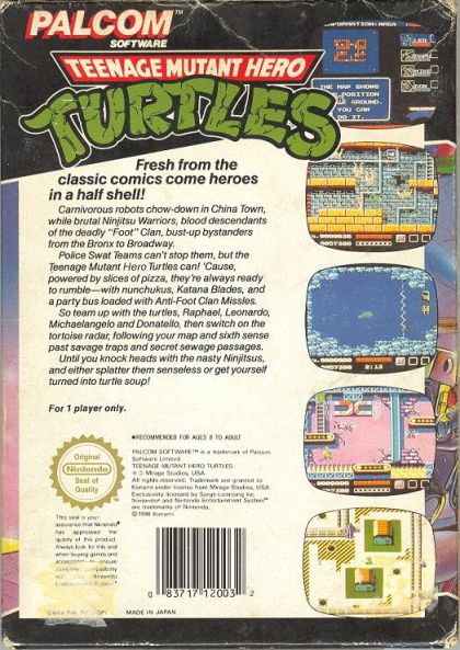 Carnivorous robots chow-down in China Town, while brutal Ninjitsu Warriors, blood descendants of the deadly "Foot" Clan, bust-up bystanders from the Bronx to Broadway. Police SWAT Teams can't stop them, but the Teenage Mutant Ninja Turtles can! 'Cause, powered by slices of pizza, they're always ready to rumble - with nunchukus, Katana Blades, and a party bus loaded with Anti-Foot Clan Missiles. So team up with the turtles, Raphael, Leonardo, Michaelangelo and Donatello, then switch on the tortoise radar, following your map and sixth sense past savage traps and secret sewage passages. Knock heads with the nasty Ninjitsu and either splatter them senseless or get yourself turned into turtle soup!