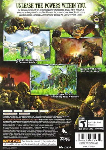 Renowned game developer Rare Ltd. introduces "Kameo: Elements of Power," a mystical action-adventure game available exclusively on Xbox 360, where the ability to morph into unique and incredible warriors allows Kameo to search out and battle ever-present evil.