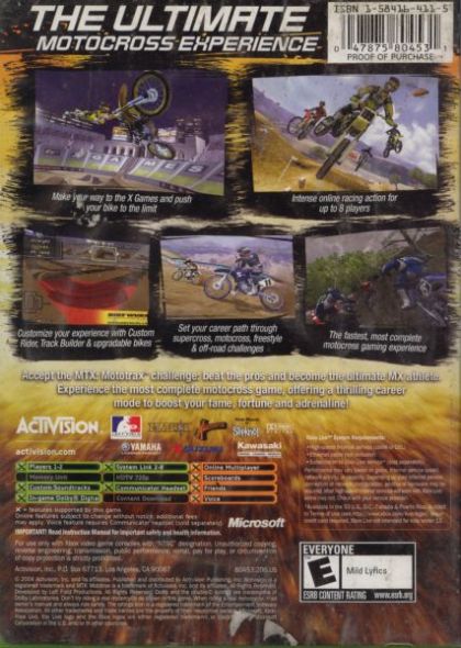 Experience the most complete motocross game ever. MTX: Mototrax pulls away from the pack with its realism, groundbreaking customization and high-speed racing action at 60 frames per second. Offering a benchmark setting non-linear career mode, gamers are challenged to become king of the track and earn all the fame and fortune of a true champion. Players can also take their skills online to compete against their friends on the PlayStation 2 and Xbox. Accept the MTX: Mototrax challenge: beat the pros and become the ultimate MX athlete.