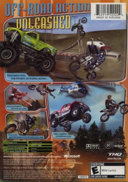 Rainbow Studios, creator of ATV Off Road Fury and Motocross Madness, returns to their heritage of motocross by developing the definitive next generation MX game. MX Unleashed is a unique blend of racing and freestyle that provides a realistic experience where the rider is now affected by real-world forces. Players can race through 50 unique tracks and explore six open worlds. Highly optimized graphics offer incredible eco-systems and texture resolution. In MX Unleashed players can select authentic gear and equipment from the top manufacturers in the world, set records, play mini games, race a helicopter - do it all on the power of a dirt bike!
