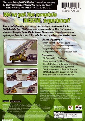 Fans of NASCAR© Winston Cup stock car racing can now experience the revolutionary racing modes of NASCAR Heat. Pick your favorite drivers and race on you favorite tracks in Single Race or Championship Season. In Beat the Heat challenges, players can take on all-new racing scenarios that capture all the thrills, drama, and split-second decisions of real race-day moments. In Race the Pro, players try to outrun the best in the sport by racing against "phantom" cars driven by real NASCAR Winston Cup drivers. Race in Normal mode for fun arcade-style racing for the whole family, or take on Expert simulation mode for the first game on the Xbox to provide the real physics of driving a 750 horsepower NASCAR Winston Cup car!