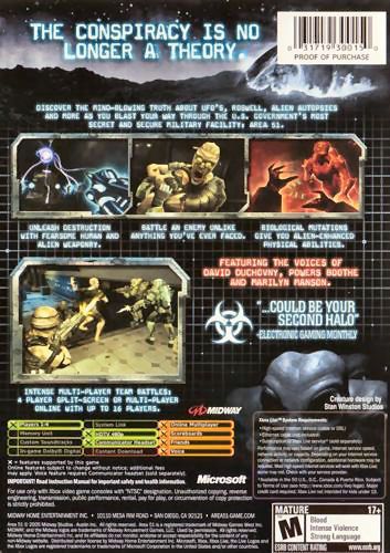 Featuring online play for the PlayStation 2 and Xbox Live, Area 51 is set in the U.S. government's most top-secret and secure facility located in the Nevada desert. Players take on the role of Lt. Nick Cross, a hazardous biological waste specialist sent to investigate. During his investigation, Lt. Cross stumbles across alien creatures and becomes infected with a biological mutagen that eventually transforms him into something not quite human. To save the earth and himself, Lt. Cross must fight to solve the enigma of Area 51.