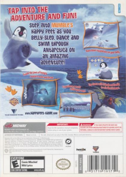 Happy Feet is an immersive adventure game filled with song and dance that puts the player in the "tap shoes" of Mumble, a young penguin born into a nation of singing Emperor Penguins. Unfortunately, Mumble can't sing a note...but he can tap dance something fierce! Mumble's inability to find his "Heart-Song" means that he can never truly belong, or more importantly, win the affection of his beloved Gloria, one of the most sought-after penguins in the nation. Following the general storyline of the film, the player will be able to experience life from the point of view of Mumble; in exploration, music, dance and interaction with the friends and enemies of the penguin's world. You will become Mumble from fluffy toddler to confident adult as you belly-slide, kick, break, swim and dash through the enormity of Antarctica. The playful and lively music soundtrack complements the exciting rhythm matching game play and two-player dance-off competitions. Mumble will leave the colony an outcast, but return a hero, using his unique toe-tapping talent to save the Emperor Nation!