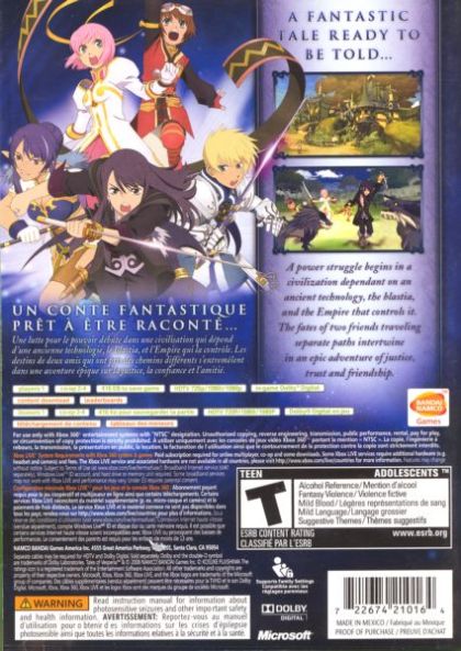 A power struggle begins in a civilization dependant on an ancient technology, the blastia, and the Empire that controls it. The fates of two friends traveling separate paths intertwine in an epic adventure that threatens the existence of all. Tales of Vesperia marks the first Tales RPG release in HD with detail and graphics never before seen in the series. Now, real-time battles are more exciting than ever with over limits, the ability to unleash fatal strikes, combinations and burst artes. The next evolution of the revered role-playing series comes to the Xbox 360.