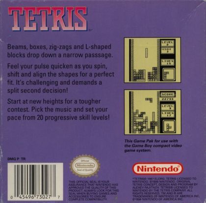 The Soviet game sensation is now on your Game Boy! Beams, boxes, zig-zags and L-shaped blocks drop down a narrow passage. Feel your pulse quicken as you spin, shift and align the shapes for a perfect fit. It's challenging and demands split-second decision making! Start at new heights for a tougher contest. Pick the music and set your pace from 20 progressive skill levels!