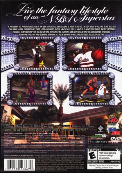 NBA Ballers features current NBA stars such as Tracy McGrady, Chris Webber and Kobe Bryant, and NBA Legends including George Gervin, Magic Johnson and Wilt Chamberlain. NBA Ballers online for PlayStation 2 enables gamers to take on the world in online tournaments and ladder challenges while they risk everything from licensed cars to mansions to other ballers that they've collected in winning games. By focusing on the one-on-one match-ups, Midway Sports Asylum is able to build each and every NBA baller and NBA Legend with his specific skill set in mind. Shaq will own the paint, Larry Bird will be raining three-pointers and Iverson will be breaking ankles with his killer crossover. With more than 5,000 polygons per player and facial motion-capture technology, no basketball videogame has ever given the gamer more realistic looking players than NBA Ballers.