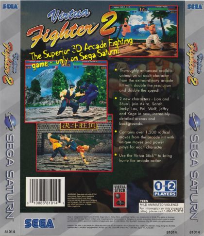In Virtua Fighter 2, the intrepid fighters return to the World Fighting Tournament. Take to the stage to see who will claim the championship title. Will it be Lau Chan, Kage-Maru, Wolf Hawkfield, Jeffry McWild, Akira Yuki, Jacky Bryant, Sarah Bryant, or Pai Chan? The answer lies within. Immerse yourself in this technically challenging game and see if you have what it takes to be the champion of the second World Fighting Tournament!