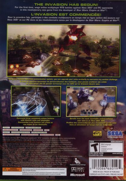 Universe at War: Earth Assault for the Xbox 360 features streamlined console controls to facilitate competitive PC vs Xbox 360 gameplay. The game also features innovative multiplayer features inspired by today's top MMOs and competitive online environments, giving players achievements, rewards, and medals but in a balanced environment. Each of the game's factions will have unique paths to victory with completely different styles of play, allowing players from across the globe to battle it out in persistent-style online "campaigns" for ultimate faction supremacy.