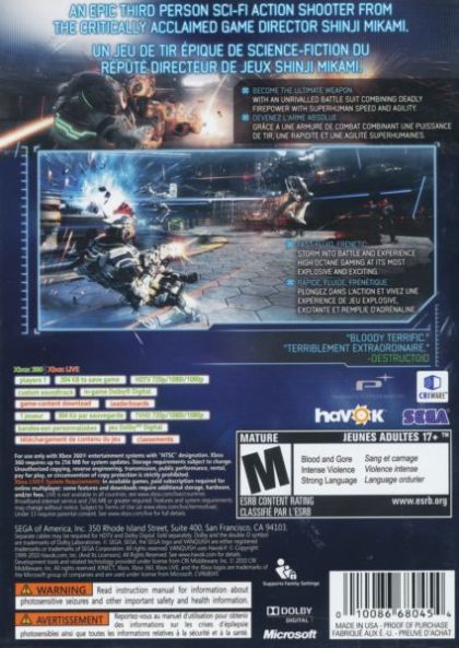 Directed by Shinji Mikami, VANQUISH is a sci-fi shooter of epic proportions with a fast, fluid and frenetic combat system, and an engaging and immersive storyline. Players take the role of Sam, a government agent kitted out with a futuristic battle suit, in a near future world where nations war over the planet's remaining energy resources. A versatile fighter with a huge arsenal of weaponry at his disposal, Sam also has an array of martial arts skills that he can use to take down his robot enemies.