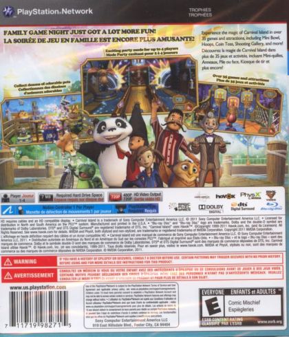 Explore Carnival Island alone or with friends , while playing games such as minibowl, ring toss, throwdown, and frogbog to earn tickets redeemable for prizes and collectibles. By completing challenges, players can create their own cheering squad consisting of lovable pets throughout their experience. Players can also have fun by interacting with fun house mirrors, photo cut-outs and upload snapshots of their experiences directly onto Facebook or send to a PlayStation®Network (PSN) friend.
