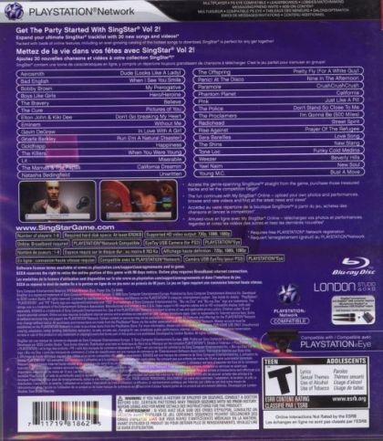 As with the first instalment of SingStar on PS3, SingStar Vol. 2 gives players instant access to SingStore, the ever-expanding online download store where extra tracks can be purchased, allowing players to add to their collection of songs and create their own SingStar playlists to suit their party mood. There are currently over 300 tracks in SingStore costing 1.49€ / £0.99 per track. Make sure you're part of My SingStar Online, the next-generation community where players can share their performances with the world after capturing them with a PLAYSTATION Eye or EyeToy camera.