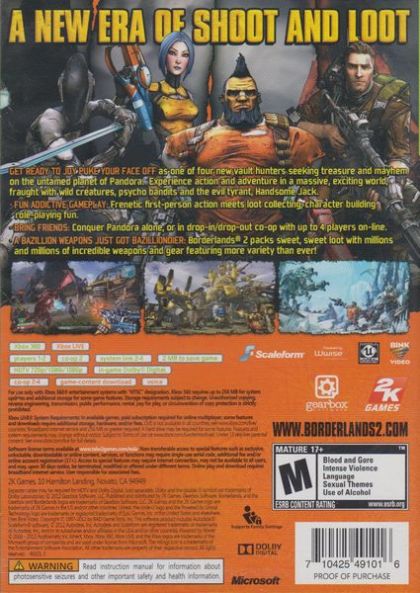 Borderlands 2 furthers the distinct blending of First Person Shooter and Role Playing genres to create the true evolution of the Role Playing Shooter. Team up with up to three other players for four-player online goodness or go old-school with two-player split-screen couch sharing mayhem as you spend hours leveling up your character and equipping them with one of the millions of badass weapons.