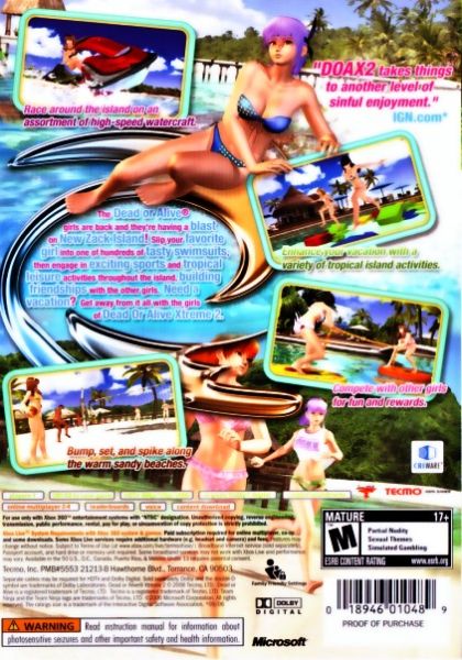 Get wet with Team Ninja's newest graphical masterpiece, the Xbox 360 exclusive, Dead or Alive: Xtreme 2! All your favorite DOA girls are back and ready to battle it out in the tropical waters of Zack's Island. Race high performance personal watercrafts, compete in assorted and alluring activities, sunbathe on white sand beaches, and go all-in at Zack's Casino. Choose your own adventure on Zack's Island and play at your own leisure in this non-linear, incredibly beautiful, sequel of life in paradise.