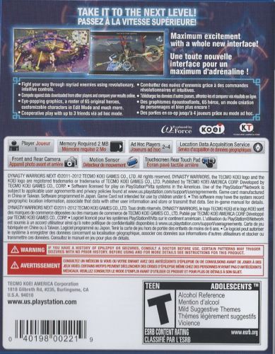 The best-selling DYNASTY WARRIORS Tactical Action series lets you step into the shoes of the greatest generals in Ancient China and enjoy the thrill of taking down thousands of enemies, becoming the greatest hero in Chinese history! DYNASTY WARRIORS NEXT, the brand new instalment built for the PS VITA, will allow players to use PS VITA's breakthrough touch pad, rear touch pad and motion sensor for intuitive controls to fight their battles, as well as connect with others and enjoy an epic experience.