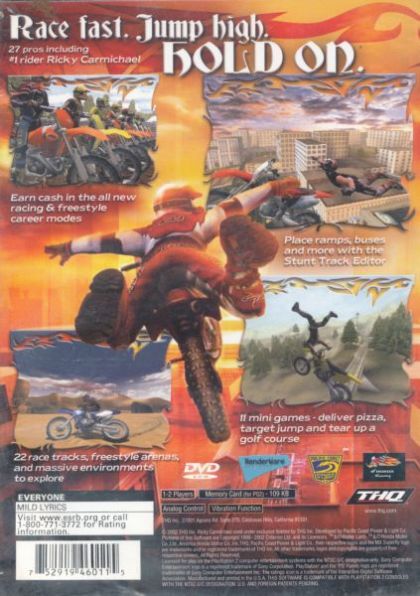 With the most career wins in the sport, Ricky Carmichael takes it to the next level along his videogame. Racing and freestyle explode on the Playstation 2 and GameCube this summer with expanded career modes, all new mini-games, top-notch pros and unbelievable stunts including the first freestyle track editor.