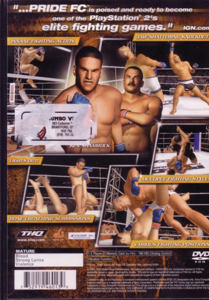 Pride FC is the most realistic "No Holds Barred" fighting videogame for the PlayStation 2 computer entertainment system. Fighters are accurately recreated in amazing detail with appearance, likeness, fighting style, movements and signature ring entrances. Various combat elements including multiple fighting positions, unique fighting styles, hundreds of moves, counters and reversals capture the intensity and authenticity of a Pride contest. With a TV-style presentation, each match-up comes to life in fully scaled arenas complete with ring announcers, lighting, pyrotechnics and realistic camera angles.
