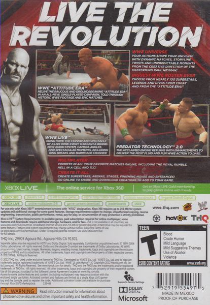 THQ's flagship WWE game franchise returns to provide the most authentic, seamless and passionate experience to date - All while turning up the attitude. WWE '13 will transform WWE gameplay through the introduction of WWE Live, completely changing the way players embrace the videogame's audio and presentation elements. Predator Technology returns to further implement critical gameplay improvements, while fan favorites in WWE Universe Mode and the franchise's renowned Creation Suite are poised to offer the utmost in player freedom. Furthermore, WWE '13 will introduce a groundbreaking, single-player campaign based on the highly influential Attitude Era. Complete with a robust roster - the largest to date in the franchise - Along with a host of additional features, WWE '13 is ready to live a revolution all its own.