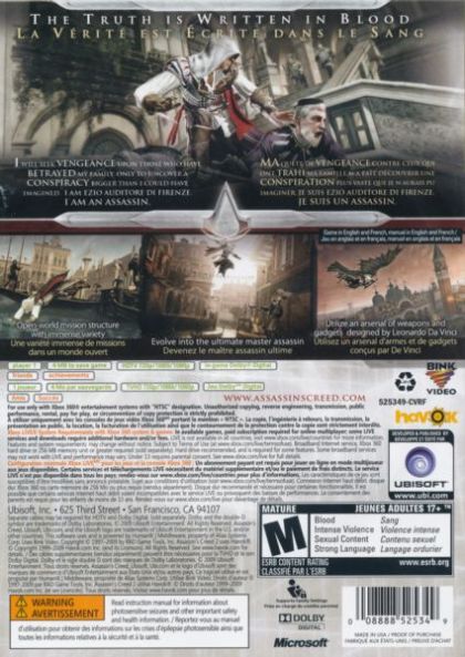 Assassin's Creed 2 retains the core gameplay experience that made the first opus a resounding success and features new experiences that will surprise and challenge players. Assassin's Creed 2 is an epic story of family, vengeance and conspiracy set in the pristine, yet brutal, backdrop of a Renaissance Italy. Ezio befriends Leonardo da Vinci, takes on Florence's most powerful families and ventures throughout the canals of Venice where he learns to become a master assassin.