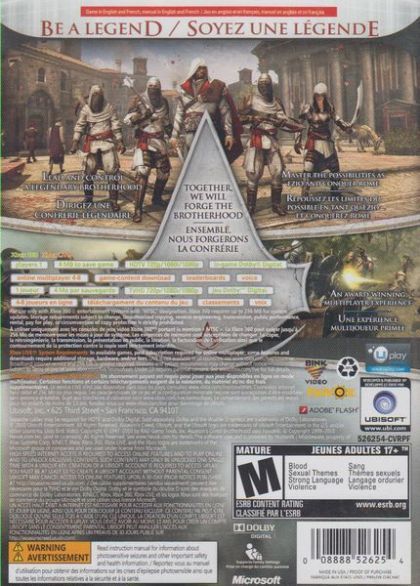 The critically acclaimed single player experience of Assassin's Creed is back and better than ever as Ezio returns in a powerful struggle against the powerful Templar Order. Now a legendary Master Assassin, he must journey to Rome, center of power, greed and corruption to strike at the heart of the enemy. Defeating the corrupt tyrants entrenched there will require not only strength, but leadership, as Ezio commands an entire Brotherhood that will rally to his side. Only by working together can the Assassins defeat their mortal enemies.
