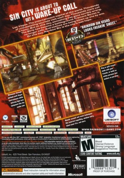 Tom Clancy's Rainbow Six makes its next-generation hardware debut in the most dramatic installment of the renowned first-person shooter franchise to date. Rainbow operatives take to the chaotic streets of Las Vegas as an escalating terrorist siege in Sin City threatens to take world terrorism to new, uncontrollable heights. The future of global security hangs in the balance as you battle to defend classic Vegas locations and environments like Fremont Street, the Strip and casinos. Experience Las Vegas like never before – through revolutionary next generation technology as you work against the clock to protect one of the world's most recognizable cities from utter devastation.