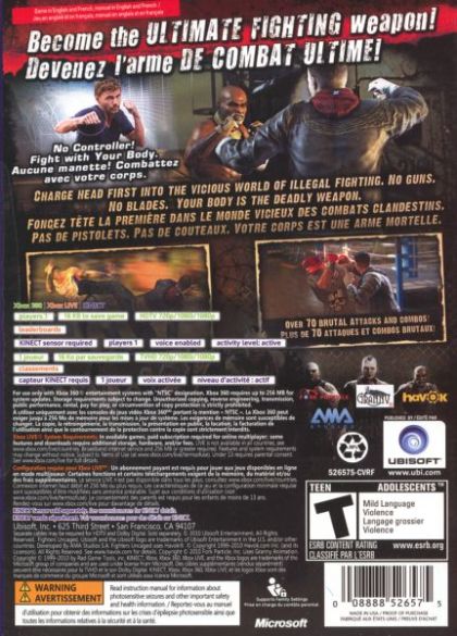 Leveraging the Kinect technology, Fighters Uncaged delivers players an immersive total-body combat experience. Players will be able to create 70 different strikes inspired by martial arts and compete in 21 different fighting environments such as rooftops, dark alleys, gritty city docks and abandoned church. Included are diverse opponents with unique fighting styles, devastating combos with voice-activated super strikes, opportunities to upgrade your character by unlocking new skills and a jump-in multiplayer feature to take your enemies down with your friends.