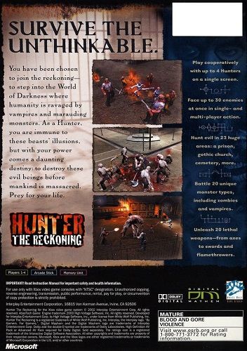 Set in White Wolfs World of Darkness, Hunter: The Reckoning is a third-person action-shooter where players take the role of one of four unique hunters – Deuce, a biker ex-con, Father Cortez, a prison chaplain, Kassandra, a raver chick and Samantha, a tough ex-cop. Armed with a variety of fearsome weaponry, players will battle it out with a plethora of supernatural enemies. Non-stop heart-pumping action, combined with outstanding graphics bring the true spirit of Hunter: The Reckoning to life, and give players a taste of the World of Darkness.