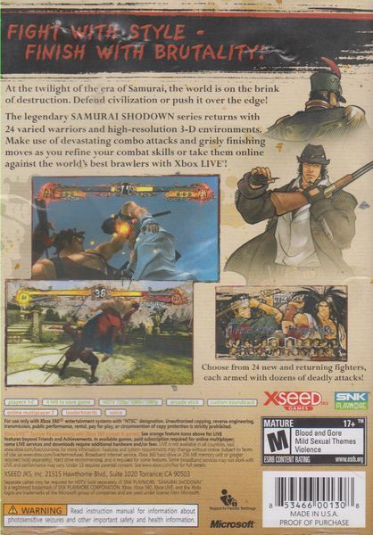 Staying close to its roots, alongside Princess Suzu, Takechiyo and a host of new characters, a plethora of old favourites from the series have been faithfully incorporated, including Haohmaru, Galford, Hanzo Hattori, Nakoruru and Ukyo Tachibana- taking the warriors to over 20 in total. Players can become any one of these unique fighters via the Xbox LIVE online entertainment network, to battle friends to see who can reach the top of a worldwide online ranking system.