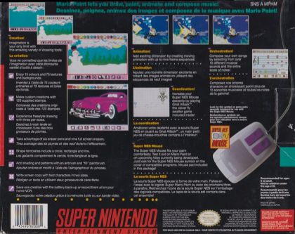 Mario Paint lets you draw, paint, animate and compose music! Creation! Imagination is your only limit with an amazing variety of drawing tools. Animation! Add exciting dimension by creating moving animation with up to 9 frame sequences. Orchestration! Compose your own songs by selecting from over 15 different musical sounds and the entire scale of notes. Coordination! Increase your Super NES Mouse dexterity by playing Gnat Attack, the clever fly swatter game included inside.