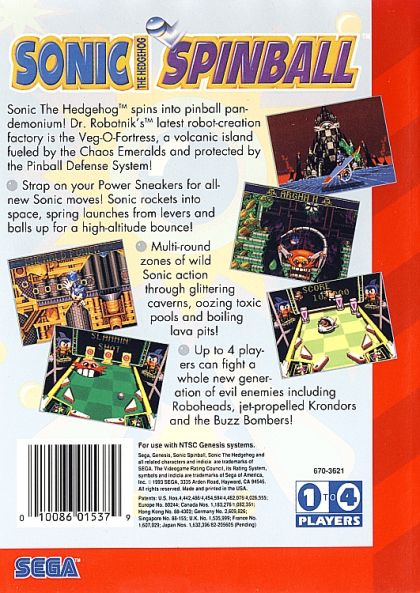 Sonic The Hedgehog spins into pinball pandemonium! Dr. Robotnik's latest robotic-creation factory is the Veg-O-Fortress, a volcanic island fueled by the Chaos Emeralds and protected by the Pinball Defense System. Strap on your Power Sneakers for all-new Sonic moves! Sonic rockets into space, spring launches from levers and balls up for a high-altitude bounce! Multi-round zones of wild Sonic action through glittering caverns, oozing toxic pools and boiling lava pits!