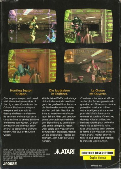 Choose your weapon and brawl with the notorious warriors of the big screen! Commission the Colonial Marine and use your weapons and your wits to destroy the base--and survive. Be an Alien and use your voracious instincts to defend the hive and rescure your Queen. Or play a Predator and use your grisly arsenal to acquire the ultimate trophy...the skull of the Alien Queen.