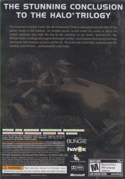 In "Halo 3," the third installment of this legendary epic, the war has come to a climax -- the Flood continue to grow in numbers and strength, the armies of Earth are scattered and decimated, and the Covenant threaten to activate the Halo, effectively destroying all life in the galaxy. Master Chief's mission: to stop the Covenant, destroy the impending Flood threat and ultimately save mankind.