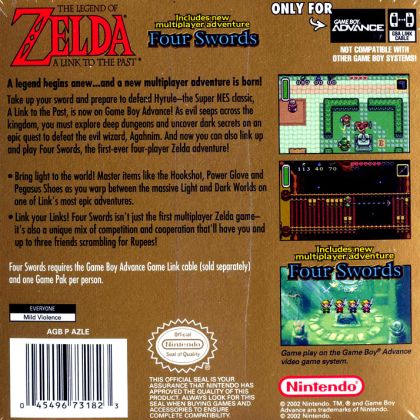 Now you have a link to one of the greatest adventures in The Legend of Zelda series. The Legend of Zelda: A Link to the Past revives the classic SNES game on the Game Boy Advance and adds a new multiplayer mode. In a Link to the Past, Link travels between the light world and the dark world, conquering fierce monsters and uncovering Hyrule's deepest secrets along the way. Also included is Four Swords, which lets you play with up to three other players, slashing through dungeons and collecting rupees. Whether you choose solo or competitive play, The Legend of Zelda will keep you occupied with its brain-bending puzzles and fun swashbuckling action.