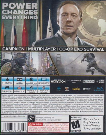 Developed by Sledgehammer Games (co-developers of Call of Duty®: Modern Warfare® 3), harnesses the first three-year, all next-gen development cycle in franchise history. Call of Duty®: Advanced Warfare envisions the powerful battlegrounds of the future, where both technology and tactic have evolved to usher in a new era of combat for the franchise. Delivering a stunning performance, Academy Award® winning actor Kevin Spacey stars as Jonathan Irons - one of the most powerful men in the world - shaping this chilling vision of the future of war.