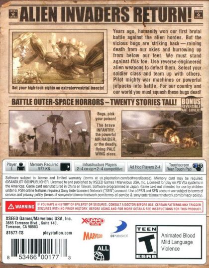 Earth Defense Force 2: Invaders from Planet Space is an expanded remake of the second entry in the acclaimed action series. Players take on the role of a "Ranger" military soldier armed with conventional weaponry, a "Pale Wing" special ops soldier equipped with a jetpack and armed with energy weapons, or new to this version, an "Air Raider," who fights indirectly through the strategic placement and dispatch of trip mines, sentry guns, air strikes and more. Players must fend off the invaders in each mission area, either alone or with up to three friends, through frenetic real-time combat set in real-life locations. Helmed by the original developers at Sandlot, this is the definitive version of what fans typically consider to be the best EDF title.