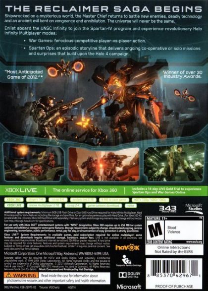 As one of the biggest video game franchises in history, the "Halo" series has sold more than 42 million games to date, generating nearly $3 billion in total franchise sales. "Halo 4" takes the award-winning series in a bold new direction, delivering its most epic and explorative campaign yet, together with a groundbreaking multiplayer offering rooted in "Halo" fiction -setting the stage for an epic new sci-fi saga.
