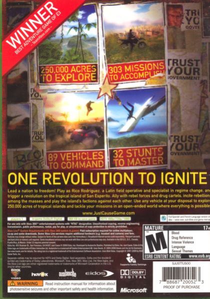 Just Cause offers the freedom to tackle your assignment however you want: play the island's factions off against one another; incite a rebellion among the masses; or build alliances with rebel forces and drug cartels. The incredibly detailed game world consists of 1,225 sq. miles of mountains, jungles, beaches, cities and villages which can be explored by land, sea and air. And you will have at your disposal one of the most varied and exciting array of vehicles, planes and watercraft ever seen in a video game.