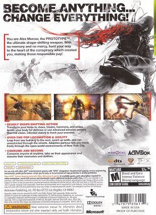 Discover what lies beyond the edge of evolution. An all-new, third-person open-world/action game, PROTOTYPE puts gamers at the helm of Alex Mercer – a genetically mutated shape-shifter with no memory of his past hell-bent on solving the mystery of his existence – as he tears through a densely populated New York City moving with Parkour-style fluidity and consuming anybody that gets in his way…assuming their physical identity, memories and abilities. Fueled by three key factions consisting of Alex, the Blackwatch (military) and a viral outbreak known as the Infected, players will venture into a deep, dark conspiracy 40 years in the making!