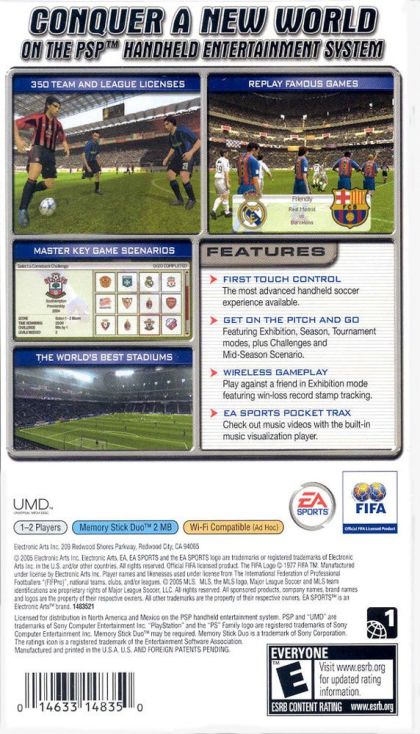 Boasting unprecedented visual and audio features, a deep selection of advanced controls, and more than 350 official team and league licenses, FIFA Football delivers console quality to the PSP. Battle your way through Season and Tournament play, or replay famous games as you fight your way out of preset match situations in the Challenges mode. With Mid-Season Scenario and wireless capabilities, FIFA Soccer is the only complete, authentic, and intelligent football experience for the PSP.