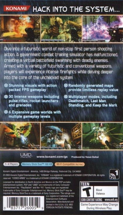 Coded Arms is a visually stunning first-person shooter that places the gamer in the role of a computer hacker who infiltrates an abandoned virtual reality system. Players will fight through various virtual battlefields against multiple types of enemies with more than 30 different weapons at their disposal. The game will also utilize the platform's wireless capabilities for intense multiplayer action. Coded Arms will be one of the PSP handheld system's premiere titles!