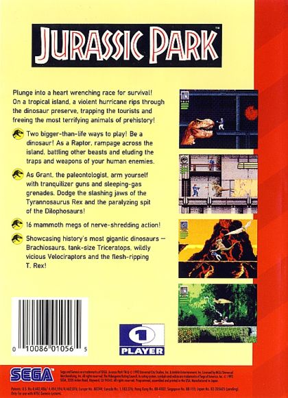 Plunge into a heart-wrenching race for survival! On a tropical island, a violent hurricane rips through the dinosaur preserve, trapping the tourists and freeing the most terrifying animals in prehistory! Two bigger-than-life ways to play: Be a dinosaur! As a Raptor, rampage across the island battling other beasts and eluding the traps and weapons of your human enemies. As Grant, the paleontologist, arm yourself with tranquilizer guns, and sleeping-gas grenades. Dodge the slashing jaws of the Tyrannosaurus Rex and the paralyzing spit of the Dilophosaurs! 16 mammoth megs of nerve-shredding action!