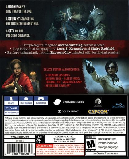 In Resident Evil 2, the classic action, tense exploration, and puzzle solving gameplay that defined the Resident Evil series returns. Players join rookie police officer Leon Kennedy and college student Claire Redfield, who are thrust together by a disastrous outbreak in Raccoon City that transformed its population into deadly zombies.Both Leon and Claire have their own separate playable campaigns, allowing players to see the story from both characters' perspectives. The fate of these two fan favorite characters is in players hands as they work together to survive and get to the bottom of what is behind the terrifying attack on the city. Will they make it out alive?