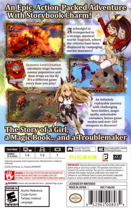 RemiLore is a rogue-lite anime-style adventure set in a colorful world where players hack and slash their enemies and cast devastating magic attacks using Lore\'s special powers. Remi, an ordinary high school student, has awakened Lore, a magical talking book who is a self-proclaimed \"master\" of magic. Together, they are both drawn into the magical world of Ragnoah, which has been overtaken by mecha monsters. Remi and Lore must venture together and find their way home, but can Remi really trust this mischievous magic book Lore? Who is mysterious android girl Choux, and why does she want to capture Lore? Will Remi ever find her way out of the magical world and return home? Remi and her companion Lore are sucked into the magical world of Ragnoah and need to find their way out Hack and slash, cast magic to battle fearsome mecha monsters, and engage in epic boss battles Melee and ranged magic combat styles can be changed based on 200 different weapons found in the world Journey through procedurally generated levels for unlimited replay value and a unique gameplay experience every time Choose from various gameplay modes, including single-player Story Mode (as Remi or Choux) and two-player Co-Op Mode Battle through the colorful world of Ragnoah in Summer, Fall, Winter, and Spring, each season featuring vastly different lighting styles Adorn Remi and Choux with various costumes Experience the rich story with full Japanese voice acting